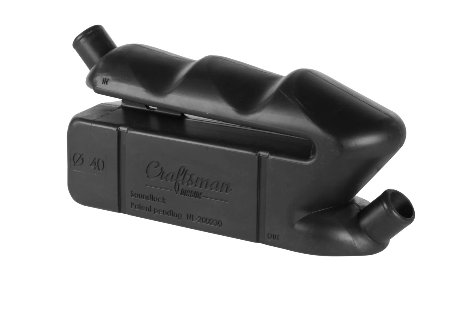 When using a wet exhaust system, the gases from the engine are mixed with raw cooling water from the heat exchanger. The lower temperature in the exhaust not only makes the use of synthetic materials possible, but also reduces the sound level. In order to reduce the noise level even further, an additional silencer may be installed. In addition to a silencer, a proper assembly also needs a water lock. The function of a water lock is to collect the cooling water when the engine is stopped, so that the water cannot flow back into the engine. In order to simplify the rather complicated engine installation, Craftsman Marine has combined the silencer and the water lock in one single unit, called the Soundlock. The result is: less cost and less installation time, whereas the unit takes up less space on board too. Mounting materials included.